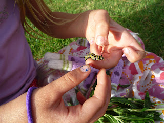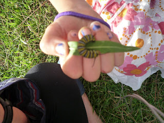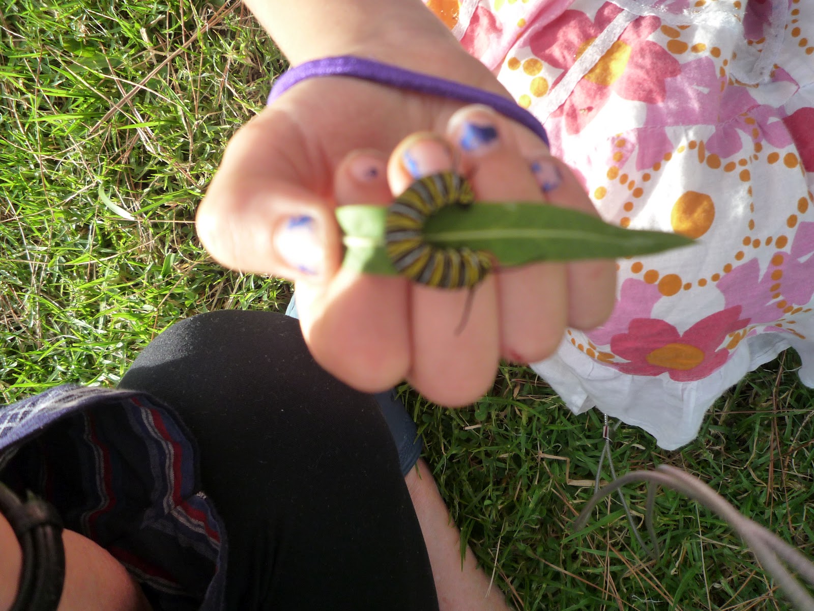 This is Jessy Bethell, and in her jar are about ten monarch butterfly caterpillars. They eat leaves of the swan plant (known in North America as milkweed). Those are swan plant leaves in her hand.