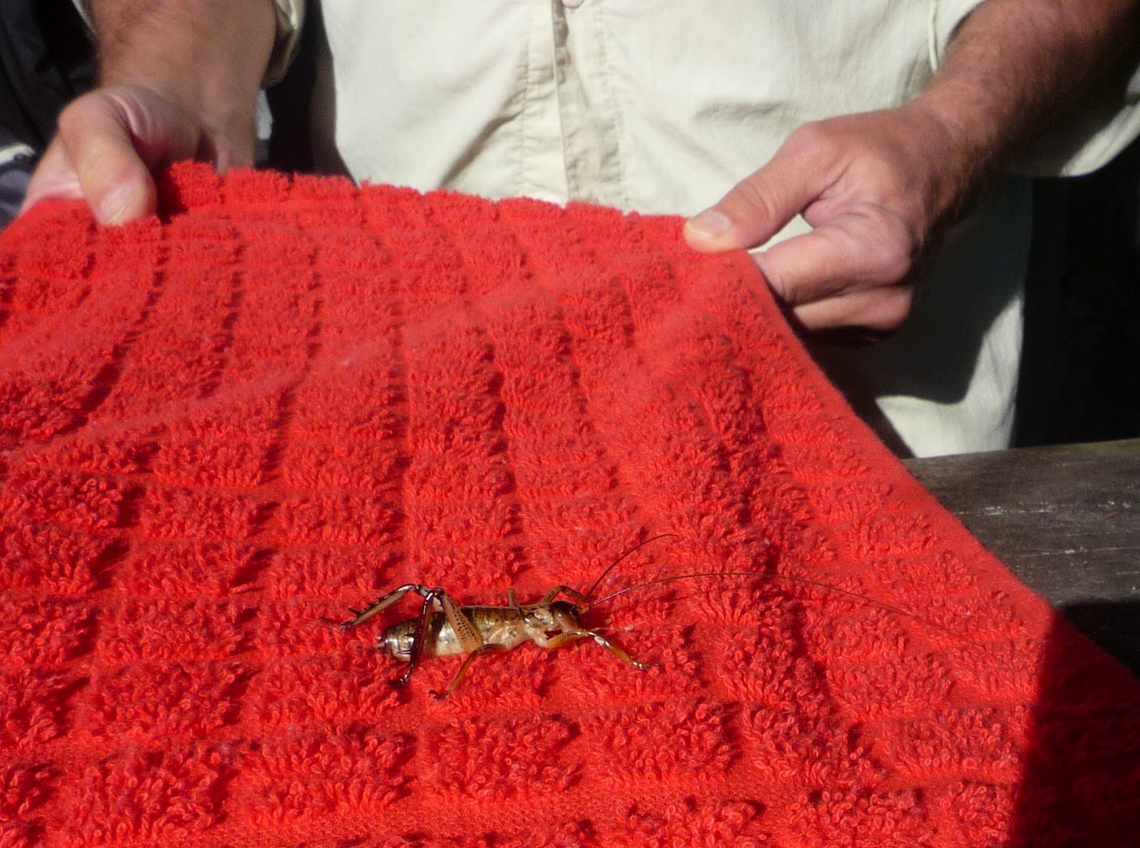 I added a bunch of photos to the blog yesterday, and I thought it might be my last post before we come home tomorrow, but we saw a weta today! It's a large scary-looking bug, the giant weta is the largest insect in the world ... The biggest weta they've ever found had a wingspan of 7 inches and weighed as much as three mice! It was found on Little Barrier Island, NZ. New Zealand is the only place wetas live. People here love wetas and revere them.